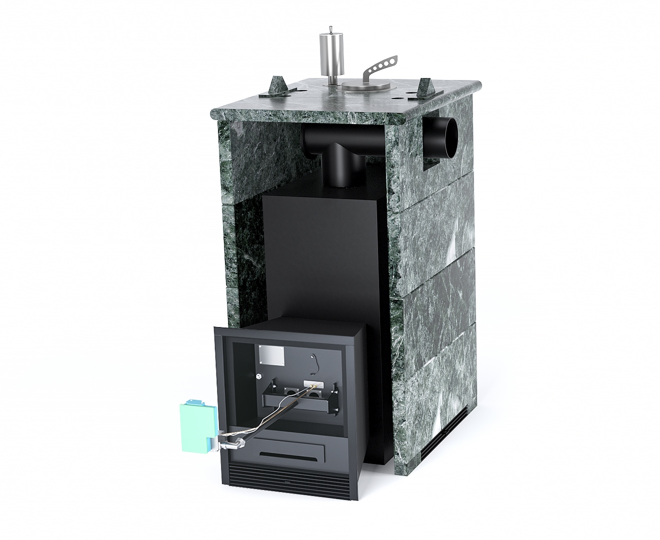 Печь Анапа в трехстороннем кожухе с боковым подключением - Марка стали - AISI 321, Варианты кожуха - Змеевик, Вид топлива - Газ, дрова Комплектация с ГГУ-40, Защита топки - Футеровка, Боковое подключение дымохода - Спереди