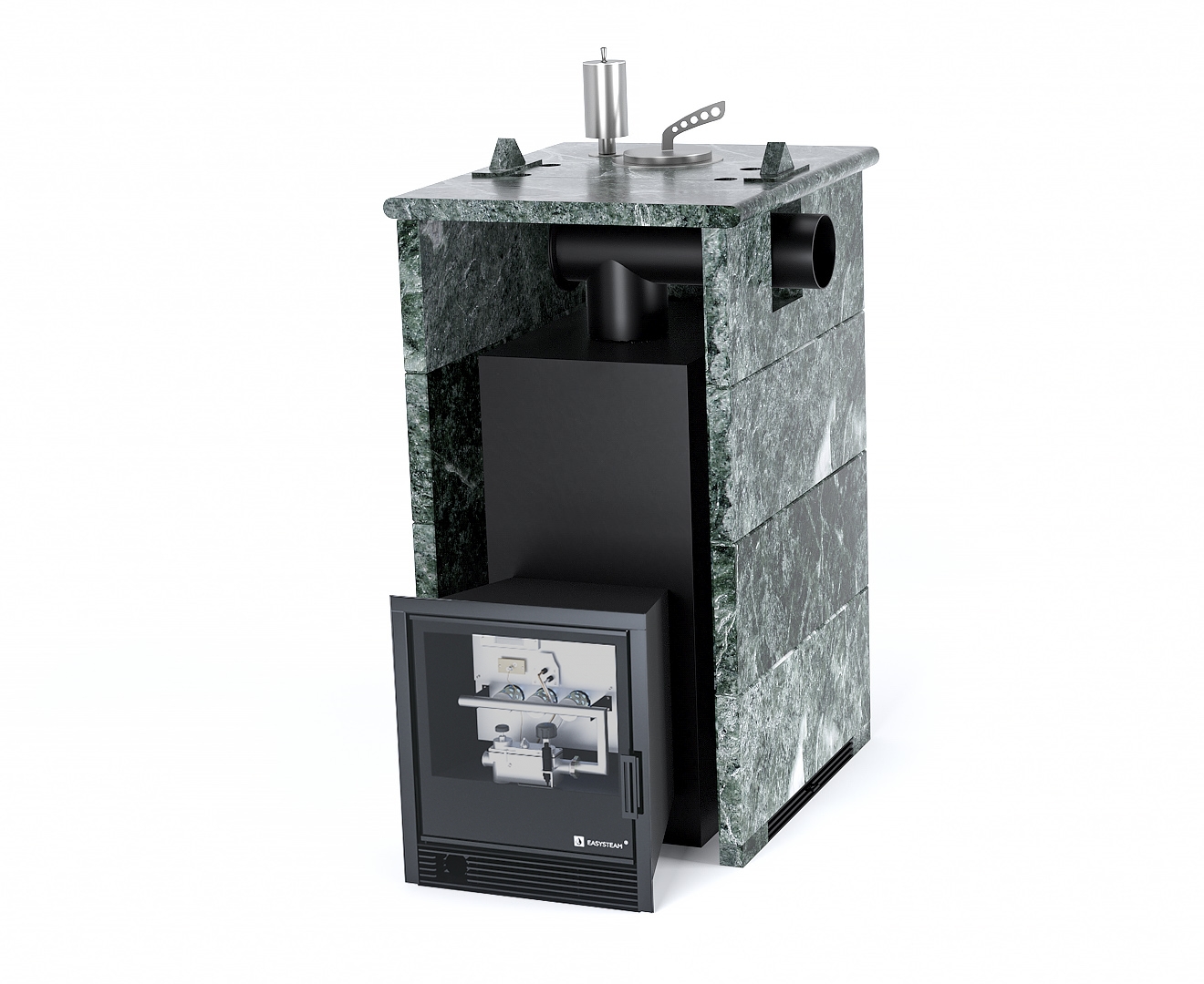 Печь Анапа в трехстороннем кожухе с боковым подключением - Марка стали - AISI 321, Варианты кожуха - Змеевик, Вид топлива - Газ Комплектация с САБК-40, Защита топки - Футеровка, Боковое подключение дымохода - Сзади