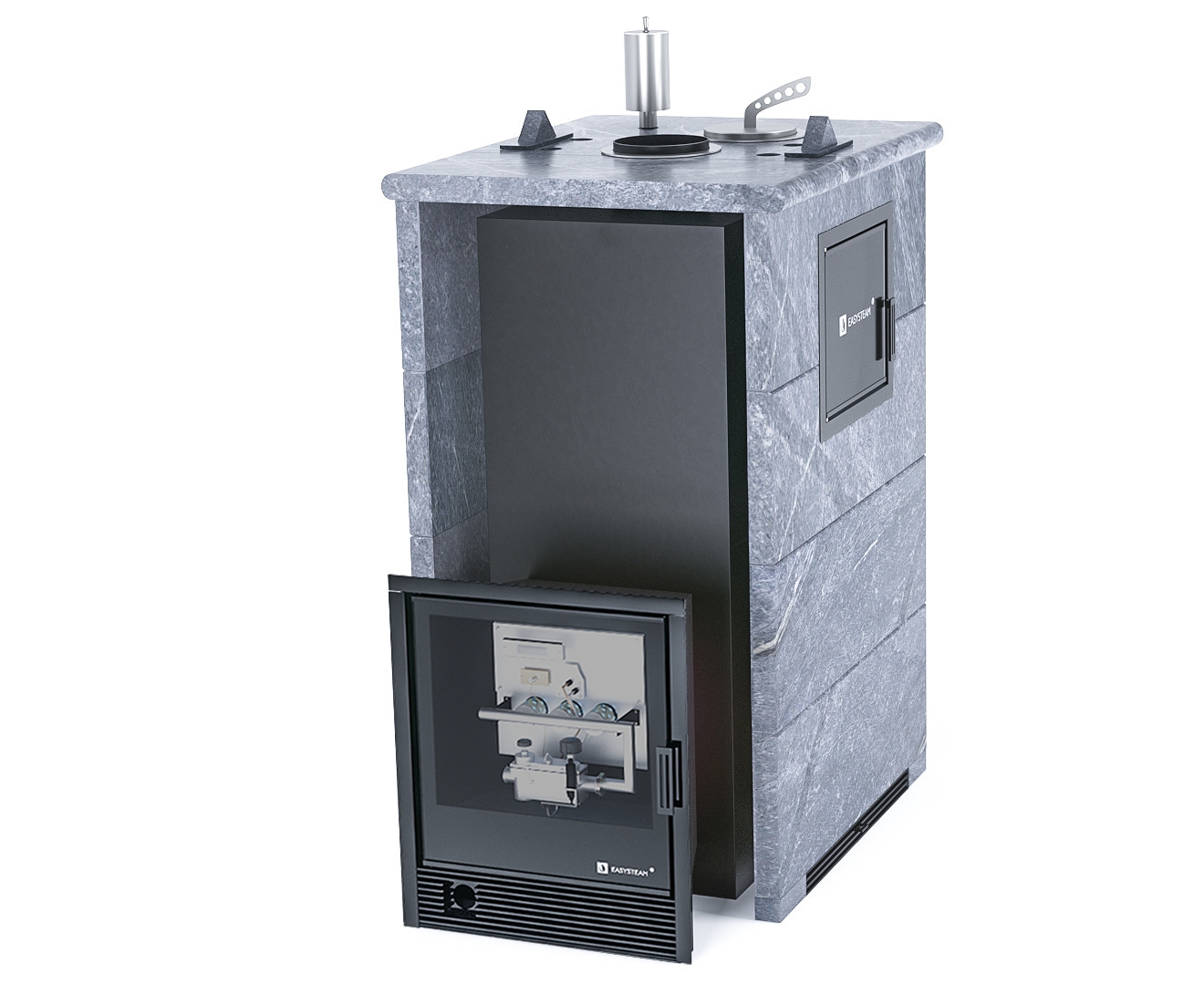 Печь Геленджик М2 в трехстороннем кожухе - Варианты кожуха - Талькохлорит, Защита топки - Футеровка, Марка стали - AISI 321, Вид топлива - Газ Комплектация с САБК-50, Боковой вход в каменку - Слева