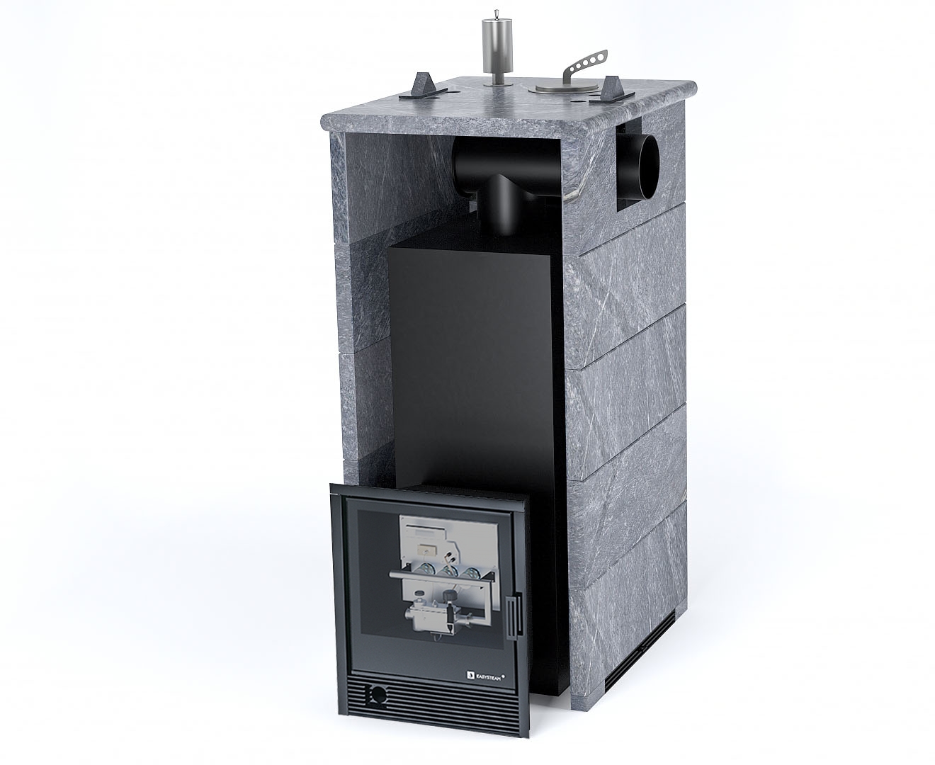 Печь Геленджик в трехстороннем кожухе с боковым подключением - Защита топки - Защ. экраны, Марка стали - AISI 430, Варианты кожуха - Талькохлорит, Вид топлива - Газ Комплектация с САБК-50, Боковое подключение дымохода - Спереди