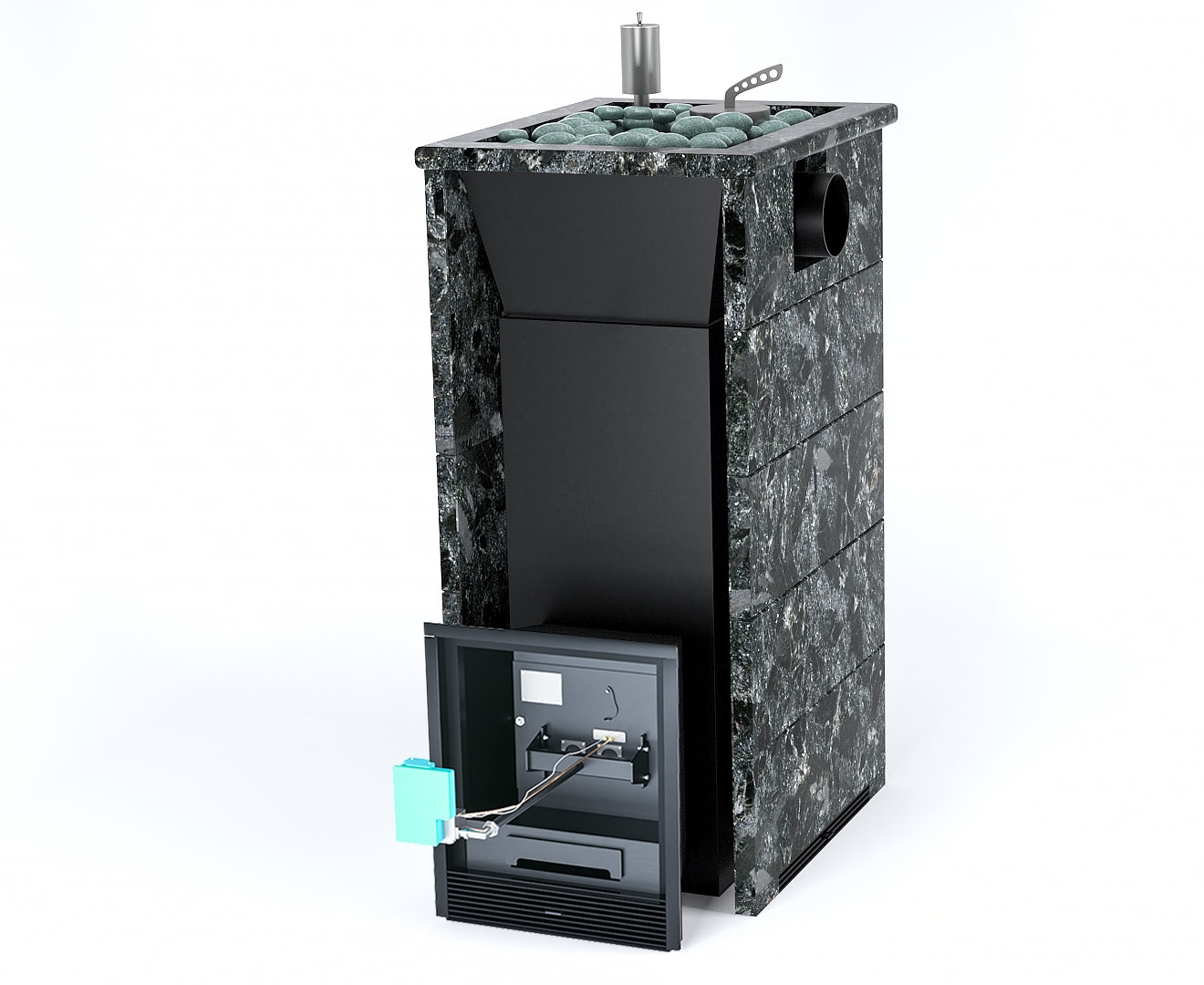 Печь Геленджик в трехстороннем кожухе с открытым верхом с боковым подключением - Защита топки - Футеровка, Марка стали - AISI 430, Варианты кожуха - Пироксенит, Вид топлива - Газ, дрова Комплектация с ГГУ-60, Боковое подключение дымохода - Спереди