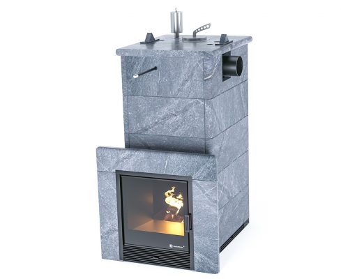 Печь Сочи в полноценном кожухе с боковым подключением - Варианты кожуха - Талькохлорит, Защита топки - Защ. экраны, Марка стали - AISI 321, Вид топлива - Дрова Стандартная комплектация, Боковое подключение дымохода - Спереди