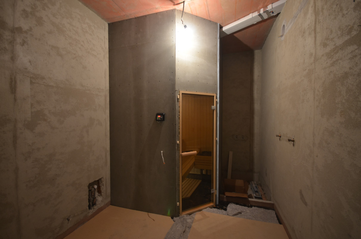 - Зашивка фасадных стен листами ЦСП (до высоты основного потолка)